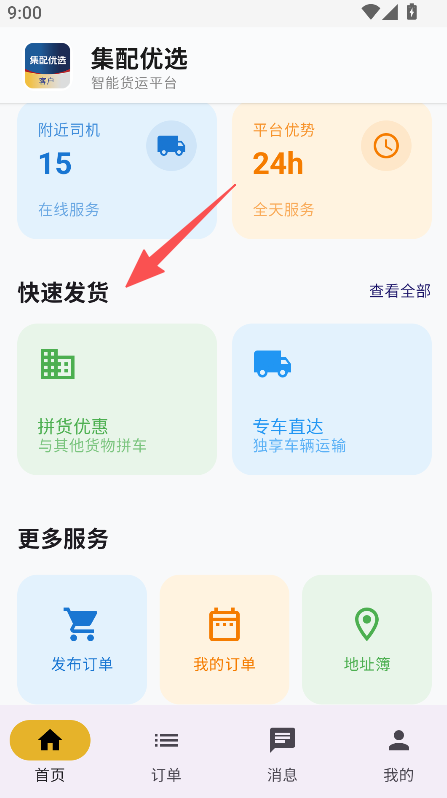 1、聚焦智能貨運服務,設附近司機等板塊,分拼貨優惠專車直達運輸方式,適配不同貨運場景的需求。