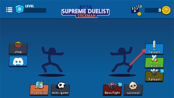 1、在主界面點擊【1player】模式,進入單人決斗關卡,開啟火柴人對戰玩法。
