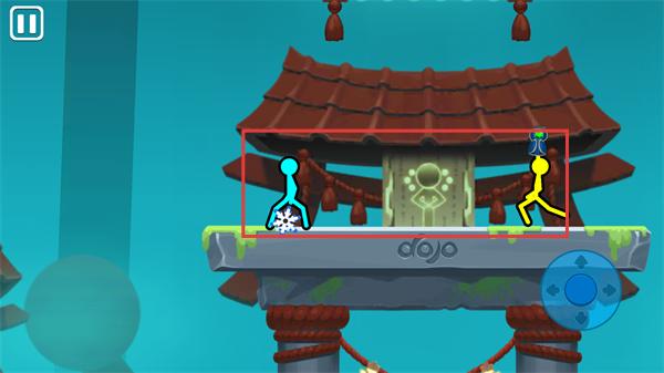 2、進入關卡后,操控己方火柴人(藍色)與敵方火柴人(黃色)在場景平臺上展開對戰。